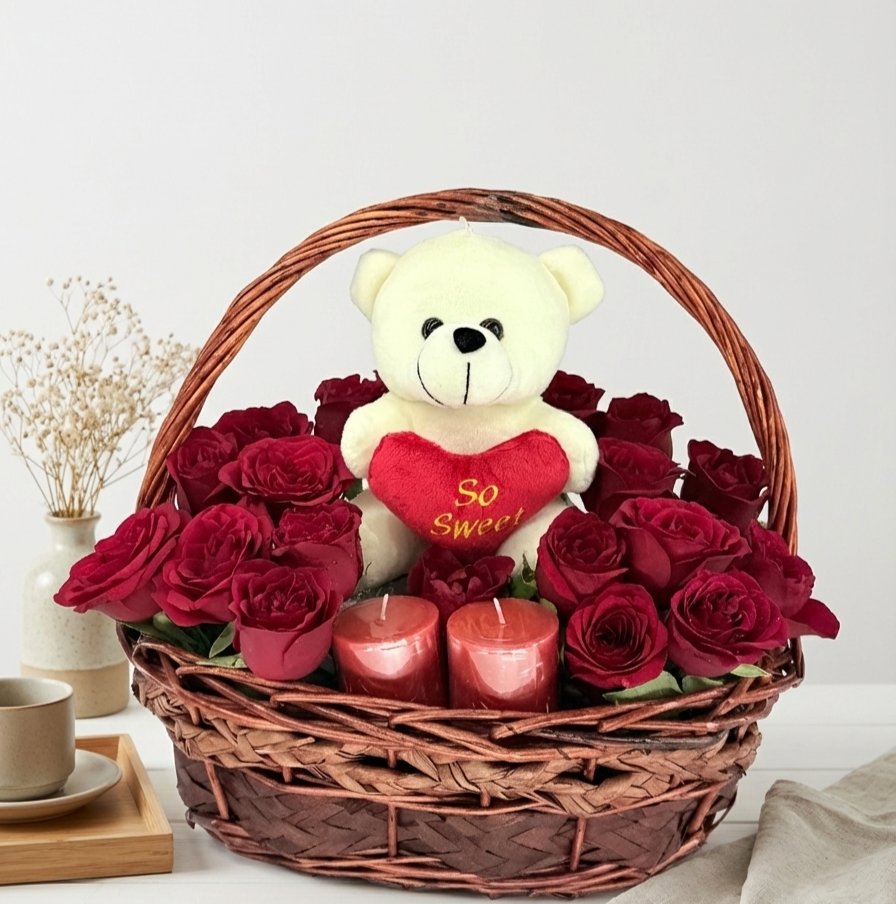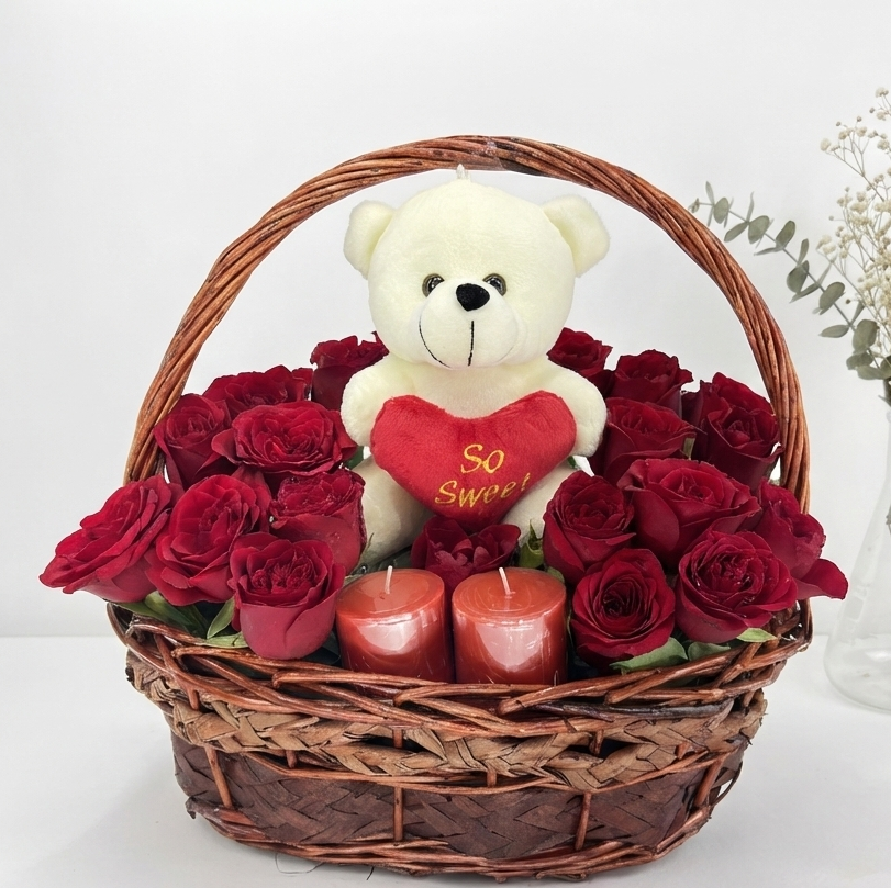 To make the moment even sweeter, we've included a cuddly 6-inch cream teddy bear holding a "So Sweet" heart, ready to deliver your warmest hugs. Complete the mood by lighting the two berry-scented pillar candles, filling the room with a warm glow and a delightful aroma. It’s not just a gift; it’s a romantic experience in a basket.