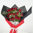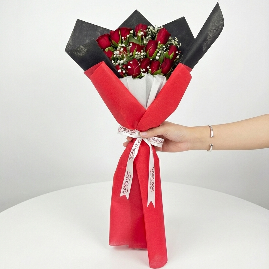 The bouquet is artfully wrapped in a dramatic dual-tone ensemble: vibrant red paper to mirror the blooms' passion, encased in a sophisticated black outer wrap that adds a touch of mystery. Tied with a pristine white ribbon, this gift is bold, beautiful, and impossible to ignore—perfect for celebrating a love that is deep and profound.