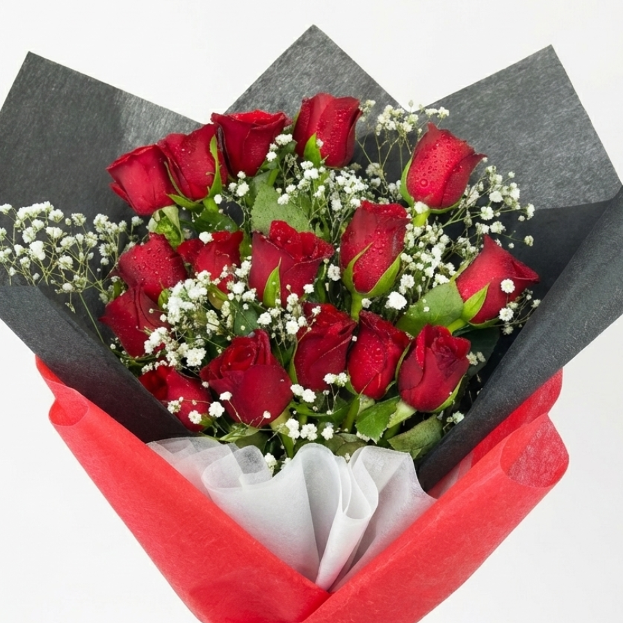 Ignite a spark of intense romance with this breathtaking arrangement. We have paired 15 velvety red roses with delicate sprigs of baby's breath to create a stunning contrast of textures.