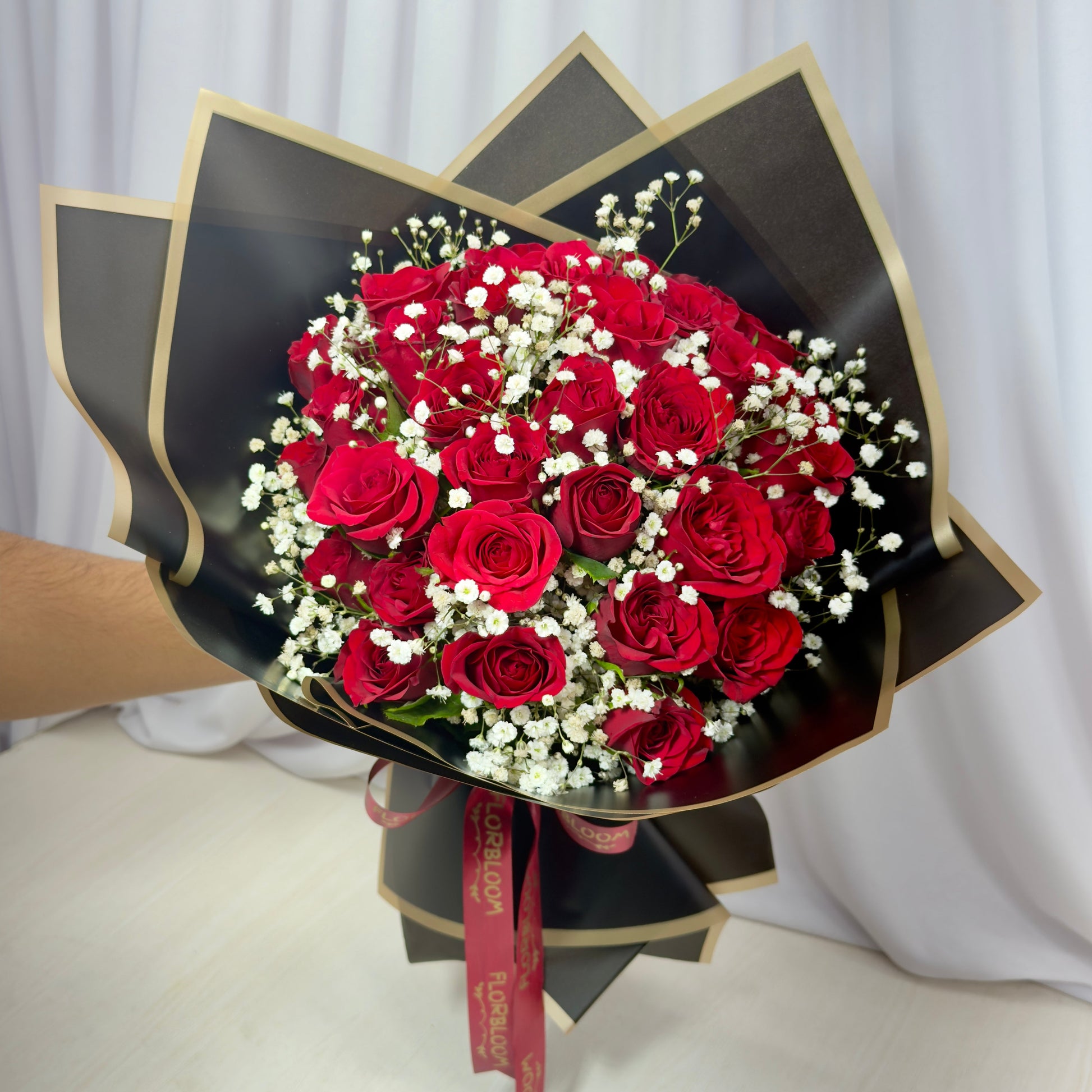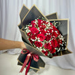 Wrapped in luxurious black paper with sophisticated gold borders and finished with a signature satin ribbon, this bouquet isn't just a gift—it’s a grand romantic gesture designed to sweep them off their feet.