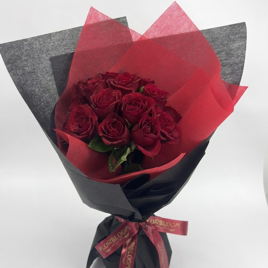 Make a bold statement of love that they will never forget. This dramatic arrangement features 18 hand-picked, blooming red roses, nestled in a stunning dual-tone wrap. The inner layer of scarlet paper mirrors the vibrancy of the petals, while the outer layer of textured black paper adds a touch of mystery and sophistication.