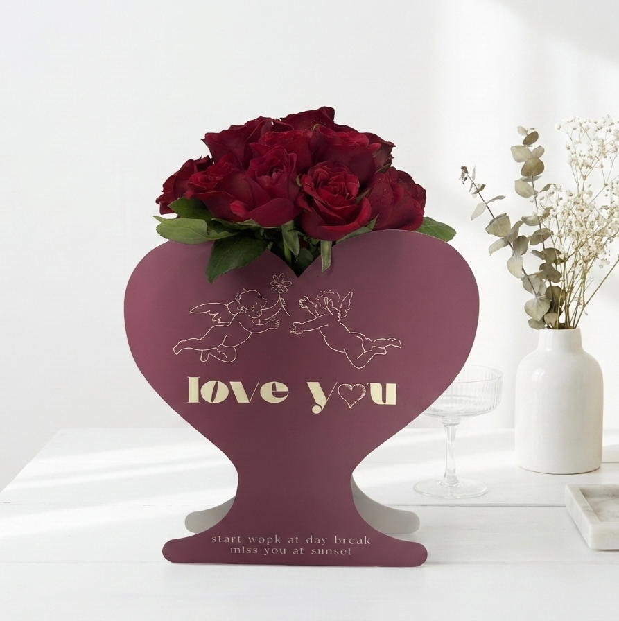The deep maroon stand features adorable gold-outlined cherubs and a bold "Love You" message, making it the perfect centerpiece for your loved one's desk or bedside table. It’s a complete gift that needs no extra vase—just unbox and let the love bloom.