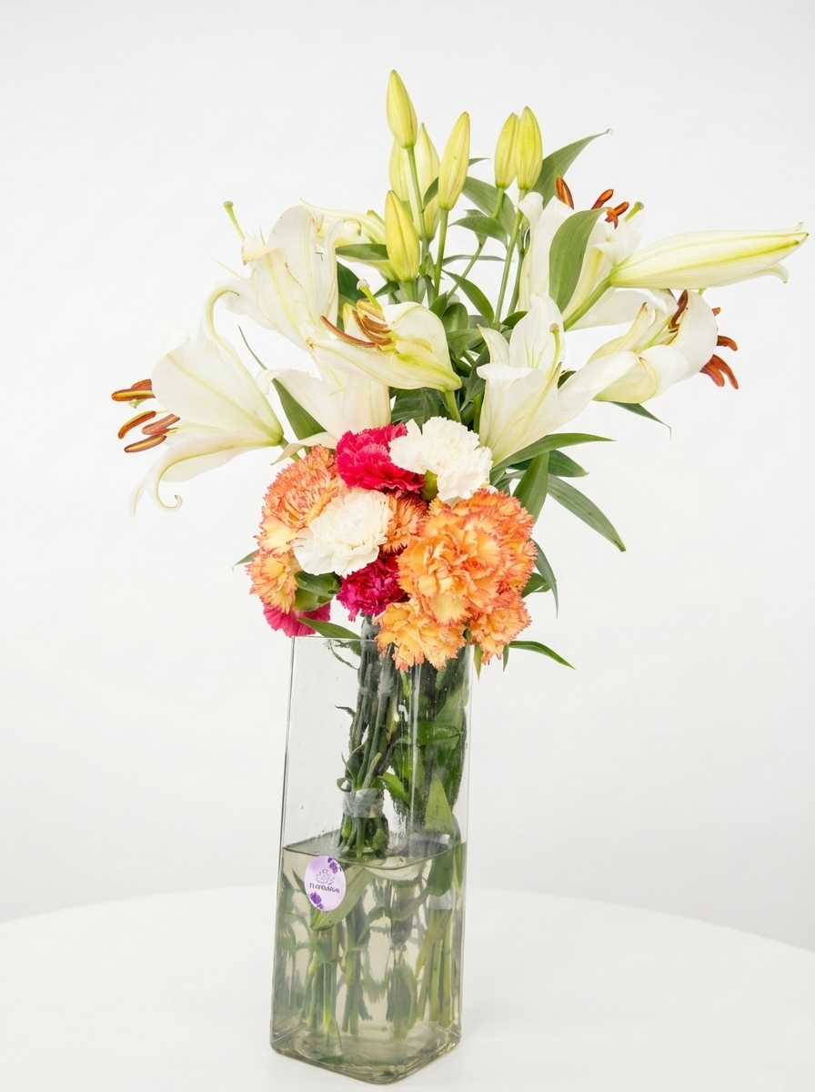 Why choose one color when you can have them all? This cheerful arrangement features a lively base of 15 mixed carnations in warm shades of orange, red, and white. Rising above this colorful garden are 5 majestic White Lily stems, adding a touch of grace and elegance to the playful mix.