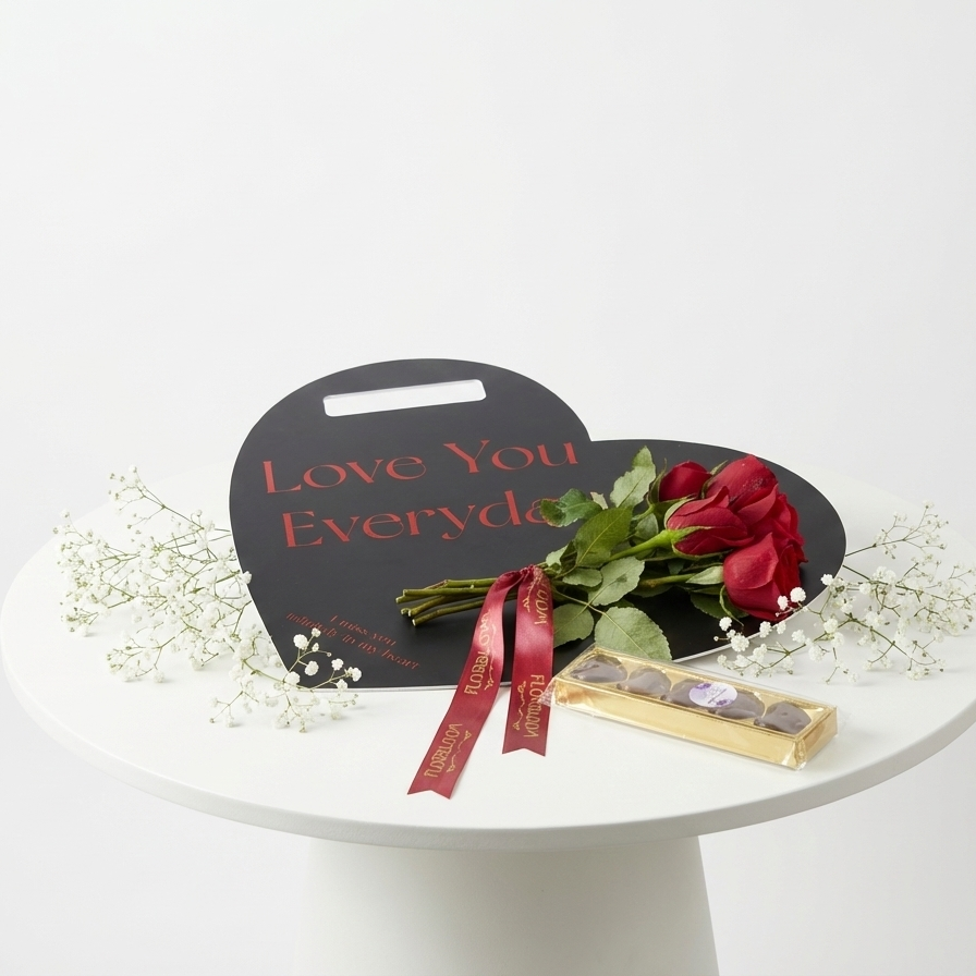 The dark matte board makes the crimson blooms pop, while the bold red typography "Love You Everyday" delivers your message loud and clear. With a convenient handle and modern design, this is the perfect romantic surprise for the one who loves stylish gestures.