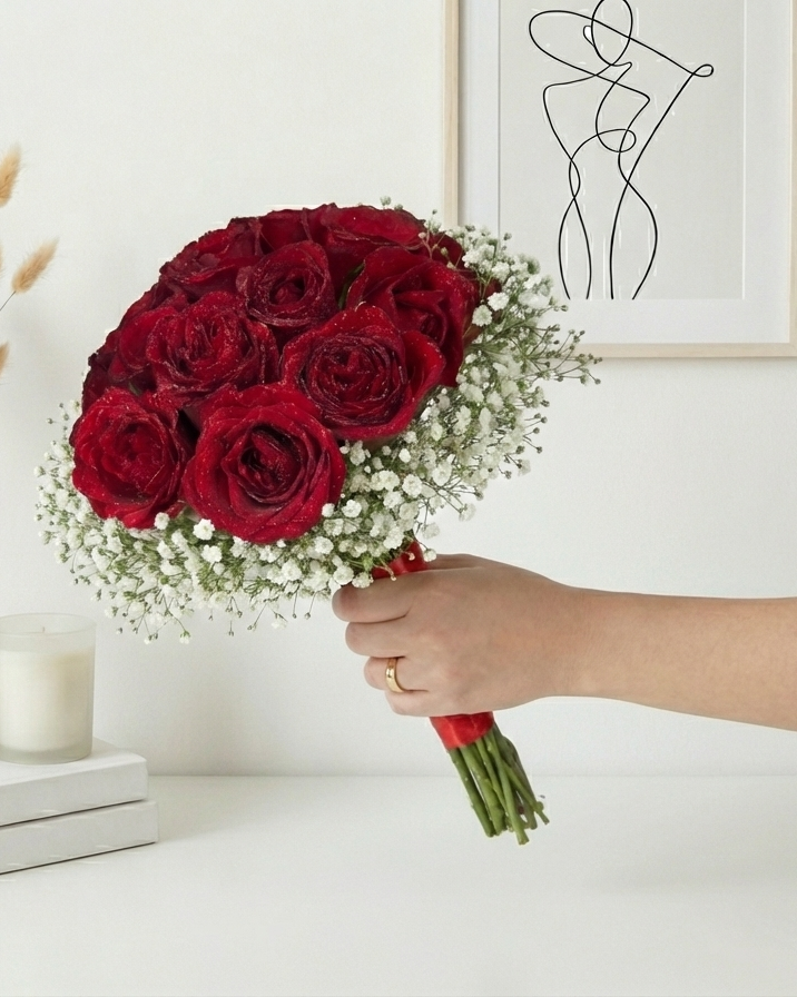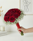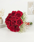 Skip the bulky wrapping paper and go for pure elegance. This exquisite hand-tied arrangement features 15 velvety Red Roses tightly clustered together and surrounded by a cloud of snowy Baby's Breath.