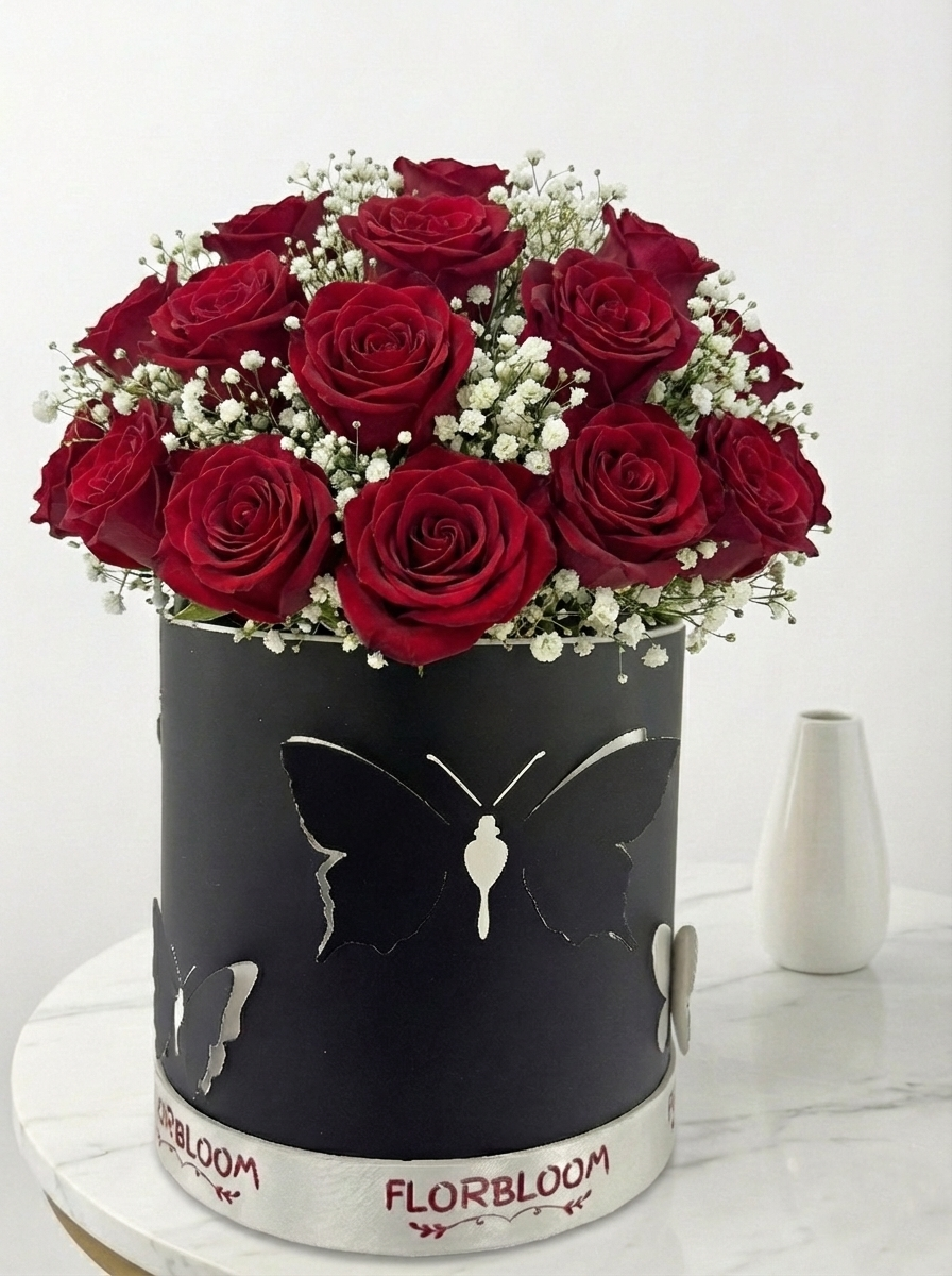 But the real magic is in the presentation. The blooms are housed in a luxurious black cylindrical box, adorned with intricate butterfly cutouts that symbolize the fluttering excitement of love. Wrapped with our signature ribbon, this is more than a gift; it is a grand romantic gesture.