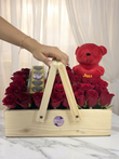 Express your deepest emotions with this exquisite gift set. Presented in a rustic light-wood crate, this arrangement features 32 premium red roses and a soft 6-inch red plush bear. Accented with a packet of artisanal heart chocolates, it is a sophisticated choice for celebrating love's biggest moments.