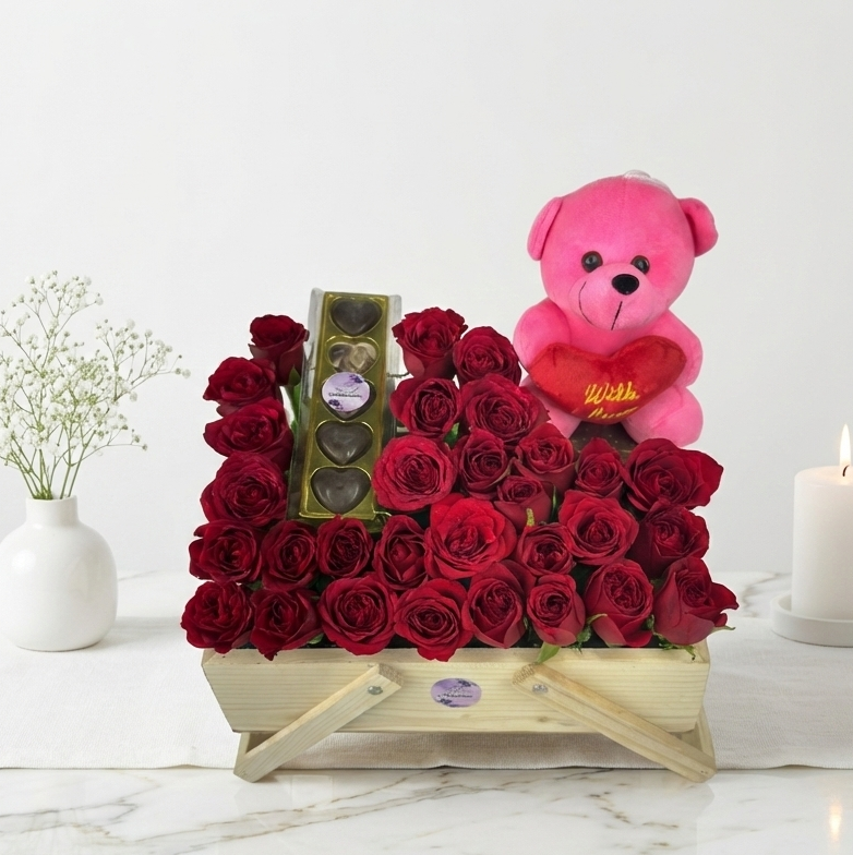 Looking for the perfect romantic gesture? Our Rustic Romance Hamper features 32 premium red roses in a chic wooden crate. We've paired the blooms with a cute pink teddy and a packet of 5 rich, handmade heart-shaped chocolates. It’s a complete package of love delivered right to their doorstep.