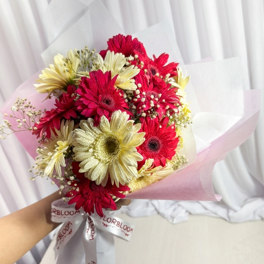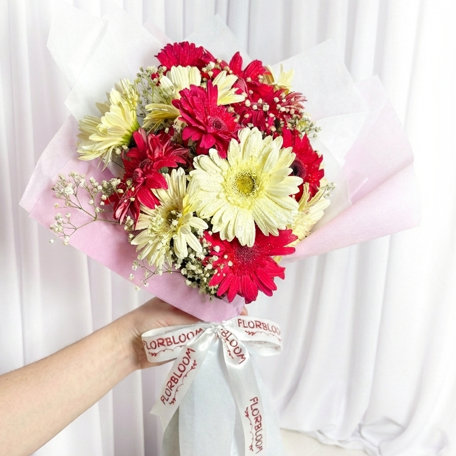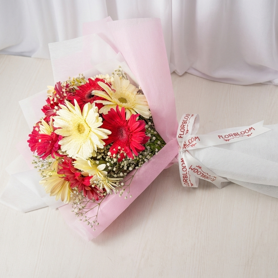 Celebrate the beautiful balance of life with this charming dual-tone arrangement. We have paired 8 vibrant pink gerberas, representing admiration and gratitude, with 8 pristine white gerberas, symbolizing purity and innocence. Accented with cloud-like sprigs of Baby's Breath and wrapped in our signature Florbloom soft-touch paper, this bouquet is a graceful way to express your heartfelt emotions. It’s simple, elegant, and undeniably sweet—just like your special bond.