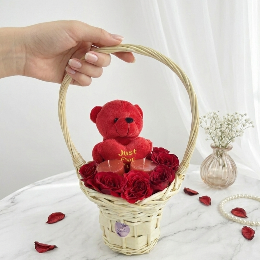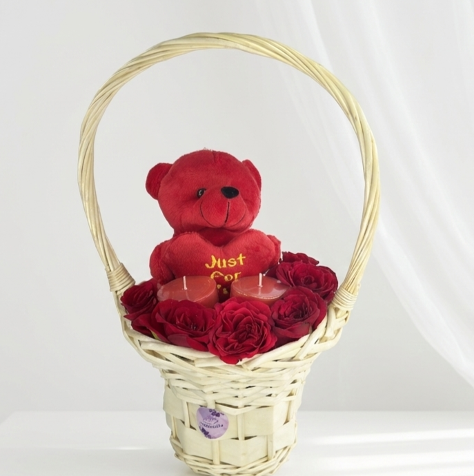 A sophisticated expression of affection. This elegant wicker basket brings together the timeless allure of red roses with the warmth of candlelight. Featuring six premium red blooms and two aromatic berry candles, this set creates an atmosphere of intimacy and relaxation. Centered by a soft, 6-inch crimson teddy bear, this hamper is the ideal keepsake for the one who holds your heart.