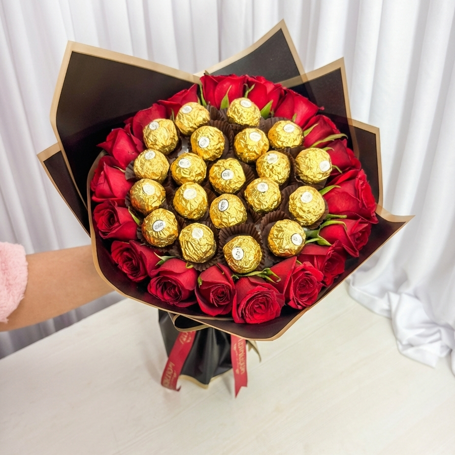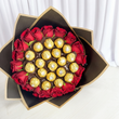 Ignite the spark of romance with a gift that speaks the language of love fluently. This luxurious arrangement is a stunning combination of nature’s beauty and gourmet indulgence. We have curated 18 velvety red roses, symbolizing deep passion, and paired them with a center of 20 golden Ferrero Rocher chocolates to add sweetness to your special moments. Wrapped in our signature premium black and gold paper, this bouquet is not just a gift; it is a grand gesture of affection designed to melt hearts.