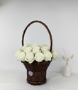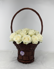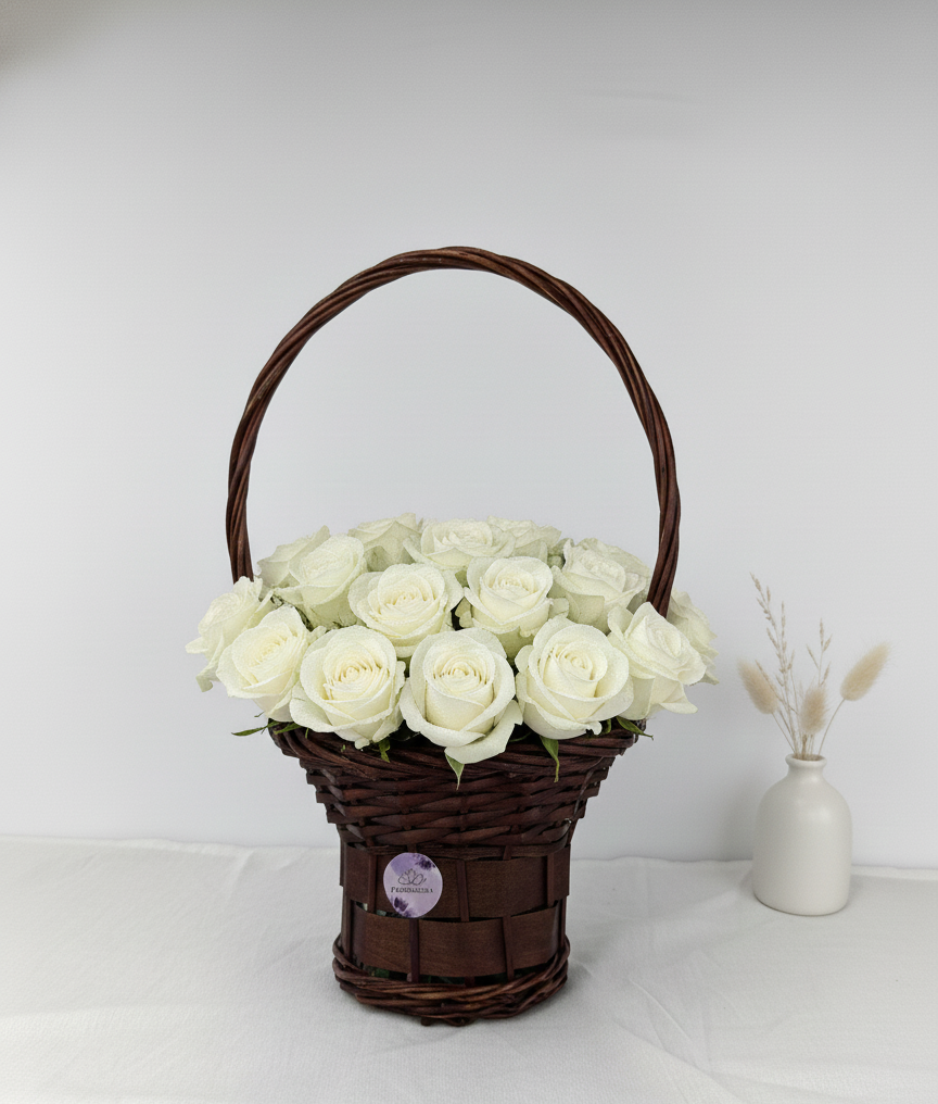 Sometimes, simplicity speaks the loudest. We have hand-arranged 20 fresh White Roses in a charming, dark-woven basket to create a display of utter tranquility. The contrast between the snowy white petals and the rustic basket creates a look that is grounded, humble, and deeply touching.