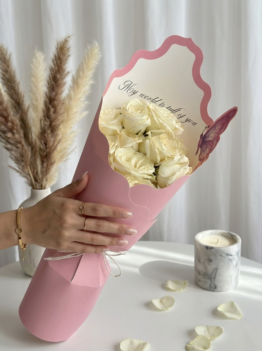 Who says flowers can't be sweet? We’ve taken 15 premium White Roses—symbolizing pure love and innocence—and wrapped them in our signature Pink Candy-Style Paper. Topped with a delicate butterfly accent, this arrangement looks just like a giant gift-wrapped confection.